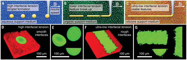 (c)硅油基支撑材料和有机硅油墨之间的超低界面张力消除了界面的不稳定性,消除了对最小稳定特征尺寸的限制。