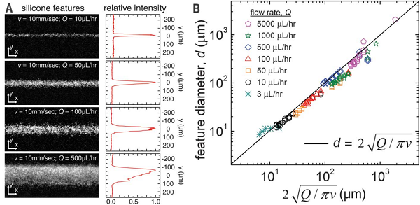 (b)从没有拟合参数的流体连续性方程中可预测打印硅胶的特征直径。