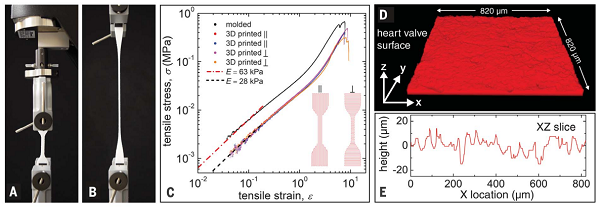 (d-e)打印硅胶心脏瓣膜的表面轮廓显示出微粗糙度,RMS值为5.5 mm。