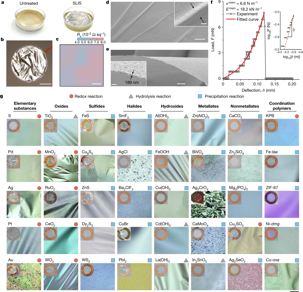 g、40个在SLIS系统中制备的自由悬挂膜的光学显微图像。显微图像有意集中在褶皱的膜区域以突出其柔性。插图是相应膜悬挂在直径为4mm的铜环上的数字照片。右上角的符号表示用于制备膜的反应类型。