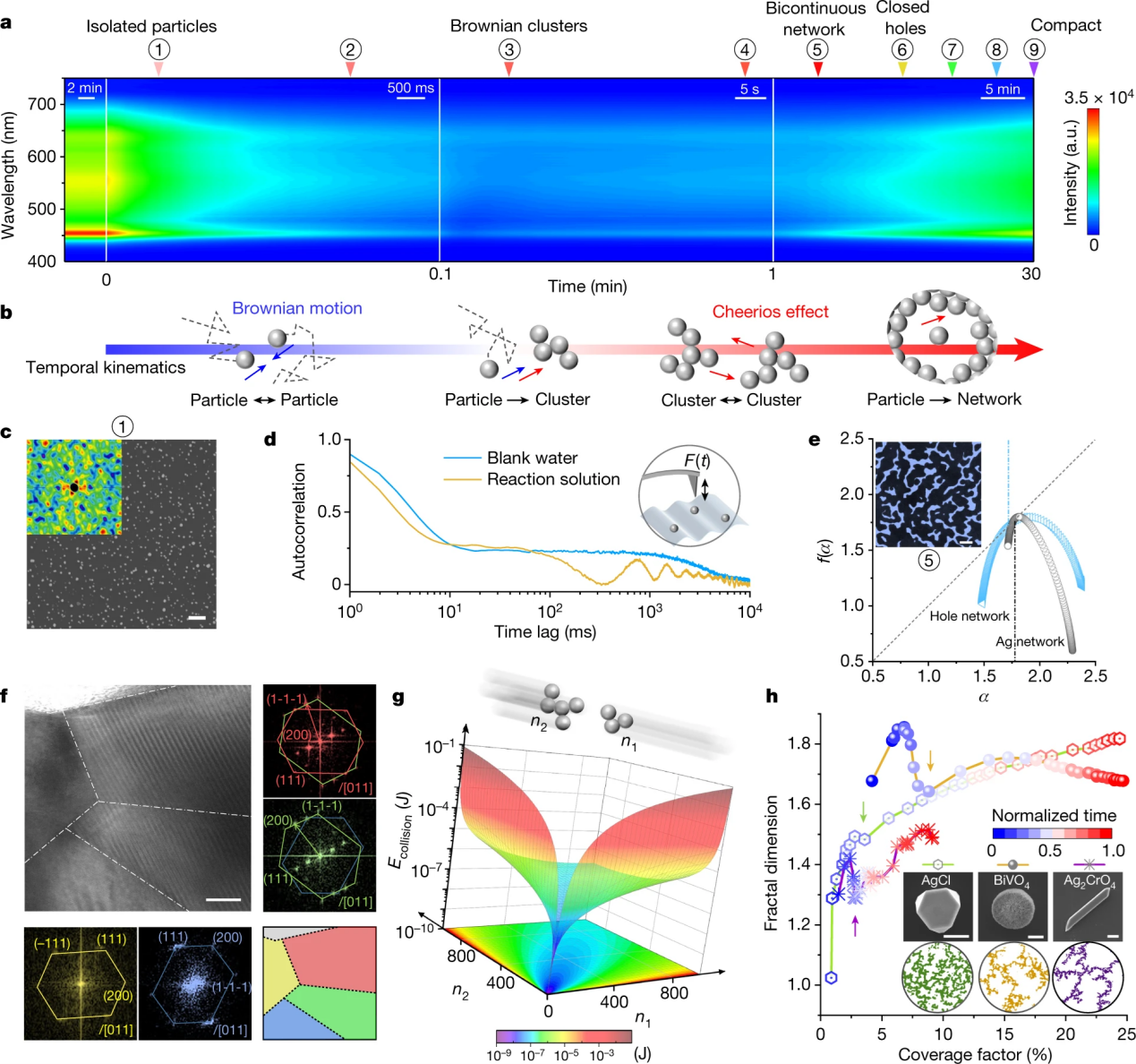 e、该图展示了在(准)双连通Ag网络中固体网络和互补的穿孔网络的多重分形谱,虚拟色彩透射电镜(TEM)图像中的虚线有助于可视化识别维度f(α)=α。