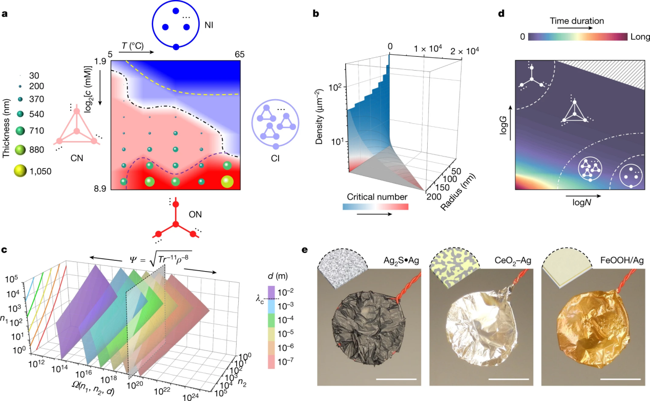 a、该图基于几何形态描述展示了从不同反应温度(T)和[Ag(NH3)2]+的初始浓度(log2(c))中发展出的图案化浮动Ag固体的相图。相区包括节点岛(NI)、团簇岛(CI)、开放网络(ON)和闭合网络(CN),颜色与相应相区相同。球体显示了局部温度和浓度决定的膜厚度,其颜色由左侧的颜色条指示。