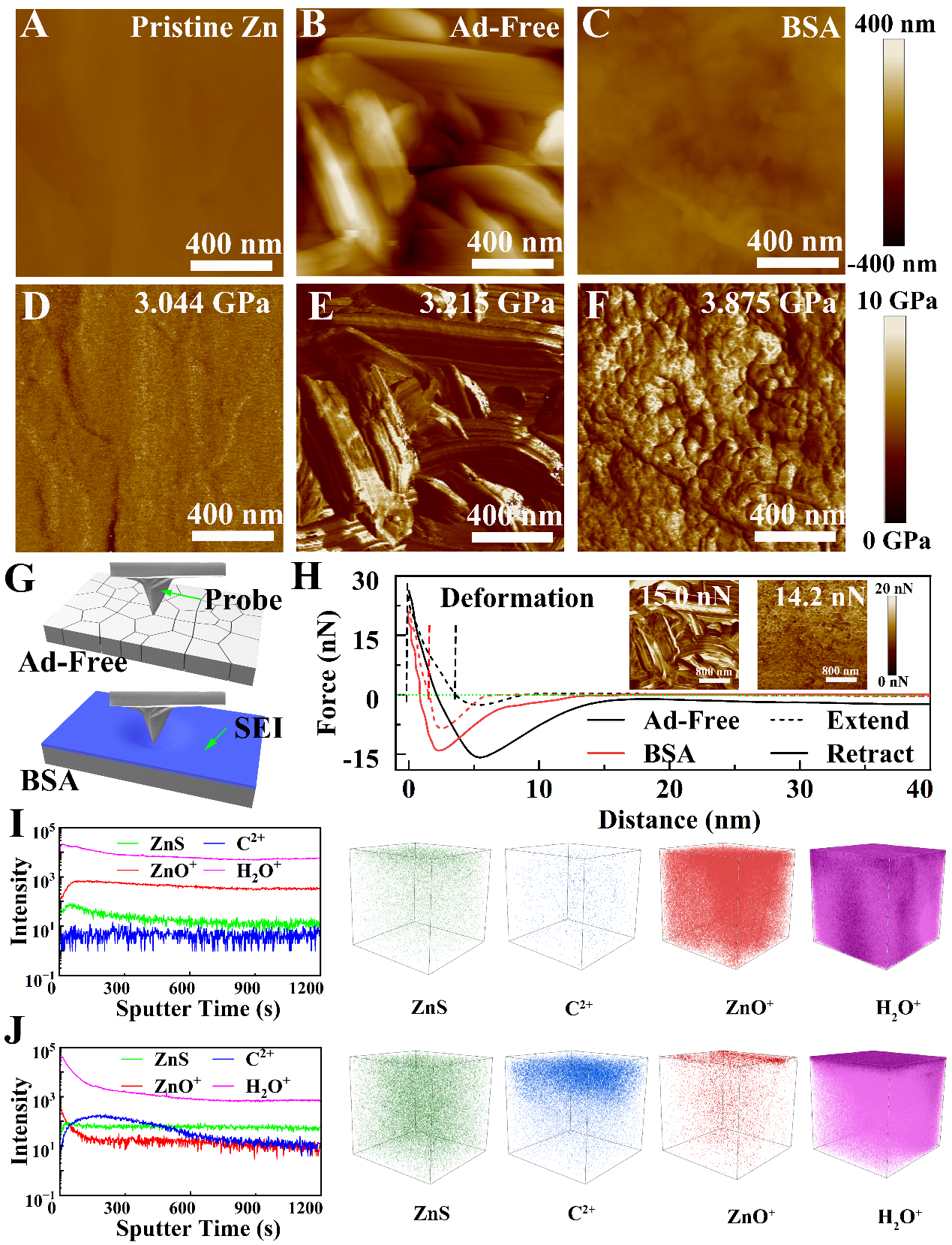 图5 AFM形貌和界面表征。(A和D)原始锌,(B和E)无添加剂ZnSO4电解液和(C和F)含BSA的ZnSO4电解液循环后制备的锌的(A-C)形貌和对应的(D-F)DMT模量映射。(G)基于AFM的纳米力学表征的示意图和(H)力-位移曲线(插图:粘附力图)。用(I)无添加剂ZnSO4电解液和(J)含BSA的ZnSO4电解液循环后制备的锌的TOF-SIMS深度剖面和对应的三维组分图。