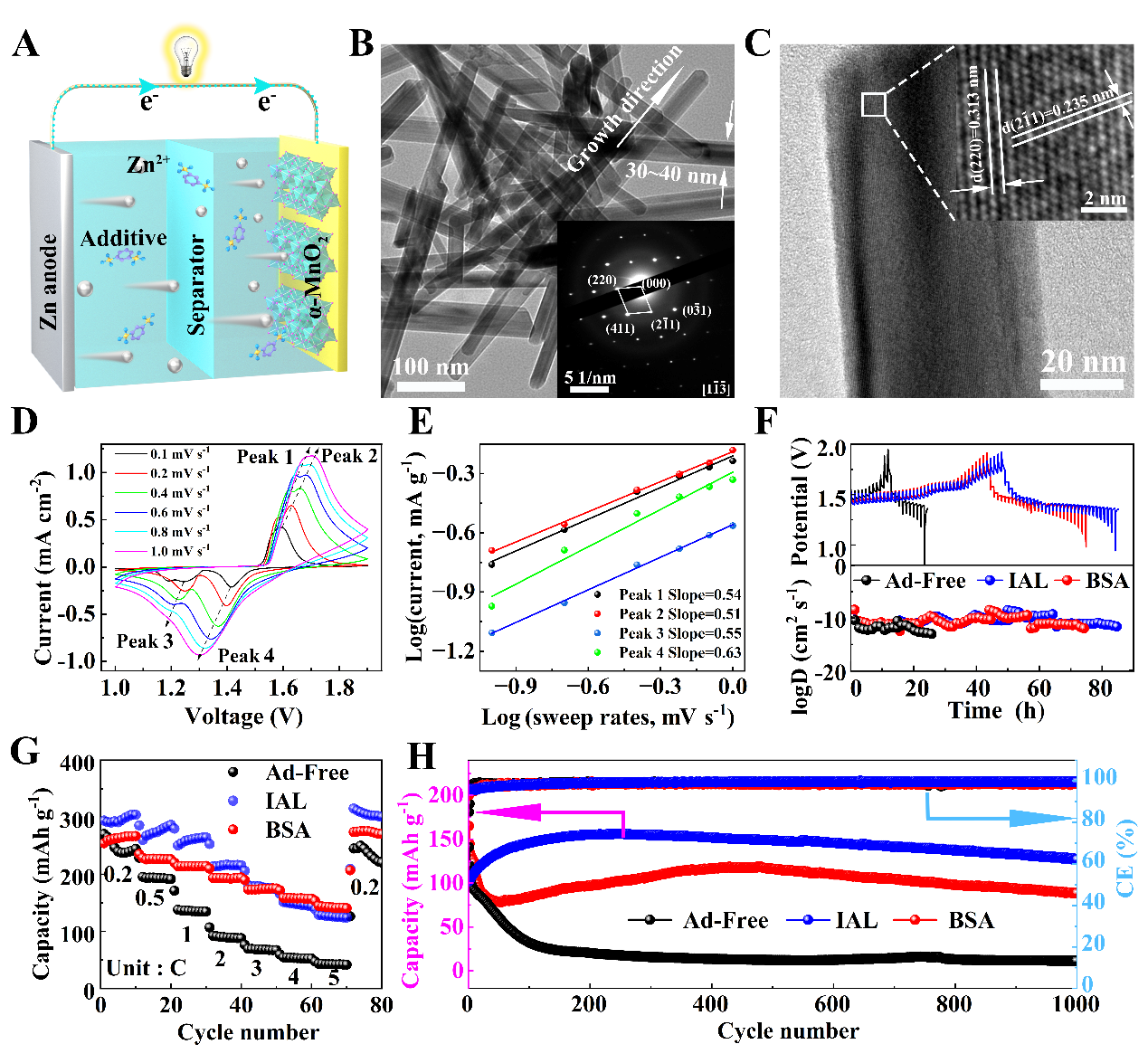 图6 Zn//α-MnO2全电池电化学性能。(A)含芳香族添加剂的Zn//α-MnO2全细胞示意图。(B)α-MnO2纳米棒的TEM图像(插图:选区电子衍射图)。(C)单晶纳米棒的高分辨TEM图像(插图:晶格分辨剖面)。(D)不同扫描速率下的CV图;I基于CV数据的线性拟合log(i)-log (v)图的对应峰值斜率。(F)由无添加剂ZnSO4电解液以及含IAL和BSA的ZnSO4电解液制备的Zn//α-MnO2全电池的GITT曲线和计算的Zn2+扩散系数,(G)在不同电流下的倍率性能和(H)在2C的循环性能。