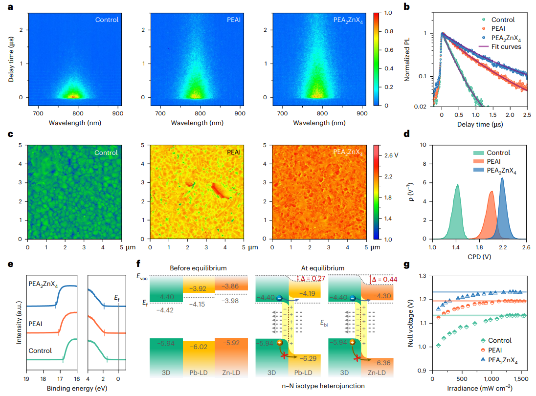 - 3D/PEAl或3D/PEA2ZnX4中的特定能级排列有助于构建具有从表面指向本体的附加内置电场的n-N同种型异质结。
