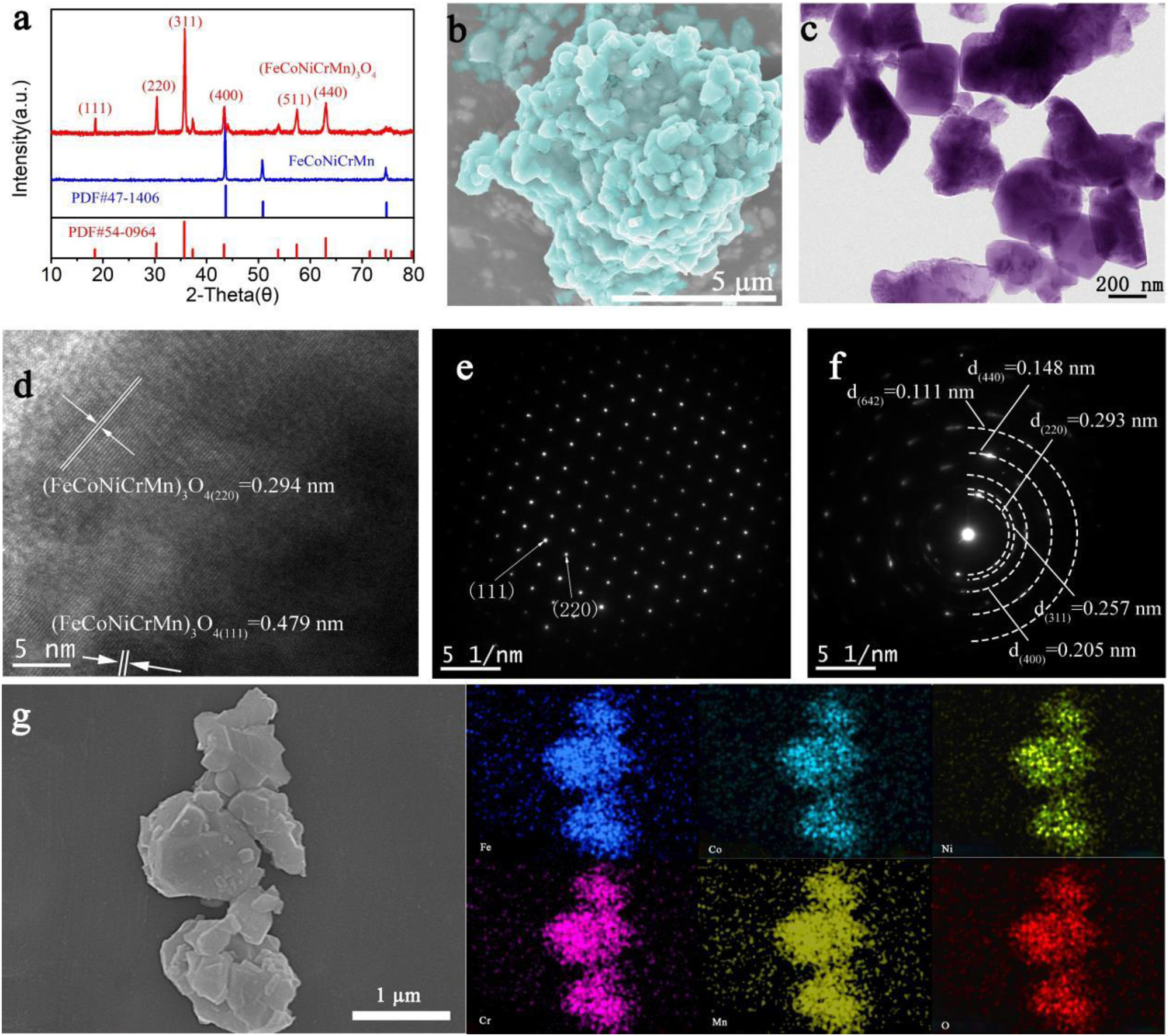 图2 (FeCoNiCrMn)3O4 HEO的(a) XRD,(b) FESEM,(g) EDS面分布图,(c) TEM,(d) HRTEM,(e,f) SAED图。 © 2022 Elsevier Ltd.