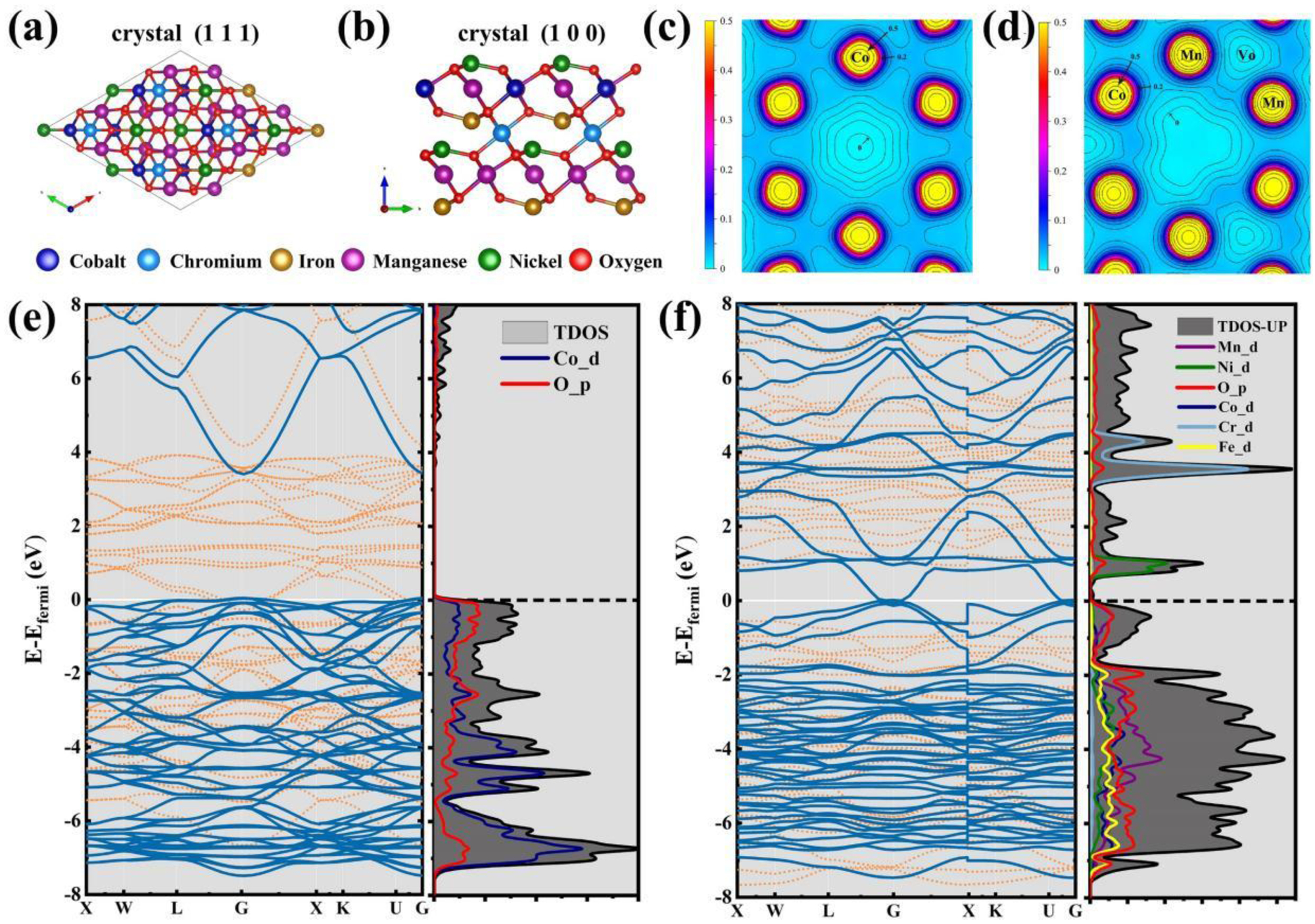 图6 (a,b) HEOs材料的晶体结构;(c) Co3O4和(d) (FeCoNiCrMn)3O4 HEO的静电荷分布;利用密度泛函理论计算的(e) Co3O4和(f) (FeCoNiCrMn)3O4 HEO中过渡金属原子的电子能带结构和投影态密度。结构通过VESTA显示。 © 2022 Elsevier Ltd.