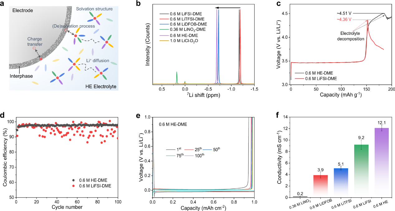 a HE电解液电池系统示意图。b单盐电解液和制备的HE电解液的7Li核磁共振谱。由于LiNO3在二甲醚中的盐溶性较低,制备了0.36 M LiNO3-DME电解液进行比较。c具有不同电解液的Li||LiFePO4电池在0.02 C电流密度下的恒流电荷分布。d使用0.6 M LiFSI-DME和0.6 M HE-DME电解液在Li||Cu电解槽中锂电镀/剥离库伦效率(CE)。e 0.6 M HE-DME电解液的恒流锂电镀/剥离剖面。f不同电解液锂离子电导率的比较。©2023 The Author(s)