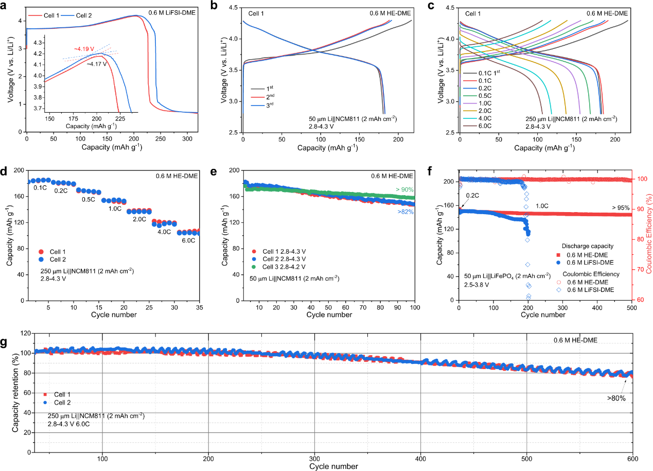 LiNi0.8Co0.1Mn0.1O2(NCM811)电池在(a)0.6 M LiFSI-DME和(b)0.6 M HE-DME电解液中以0.1 C (1 C=180 mA g−1)的倍率在2.8-4.3 V电压范围内的恒流充放电曲线。对NCM811和50 μm锂金属箔进行容量为2 mAh cm−2的电池测试,得到负/正容量比(N/P)为5。c NCM811电池在0.6 M HE-DME电解液中不同倍率的恒流充放电曲线。d NCM811在0.6 M HE-DME电解液中的电化学倍率性能。e NCM811在0.6 M HE-DME电解液中以0.1 C的倍率循环三次,然后以0.333 C的倍率在不同电压范围内循环。f LiFePO4 (LFP)电池的循环性能在以1.0 C的倍率循环之前,以0.2 C的倍率循环3个周期。g NCM811电池在0.6 M HE-DME电解液中以6.0 C的倍率循环的长期循环能力保持。©2023 The Author(s)