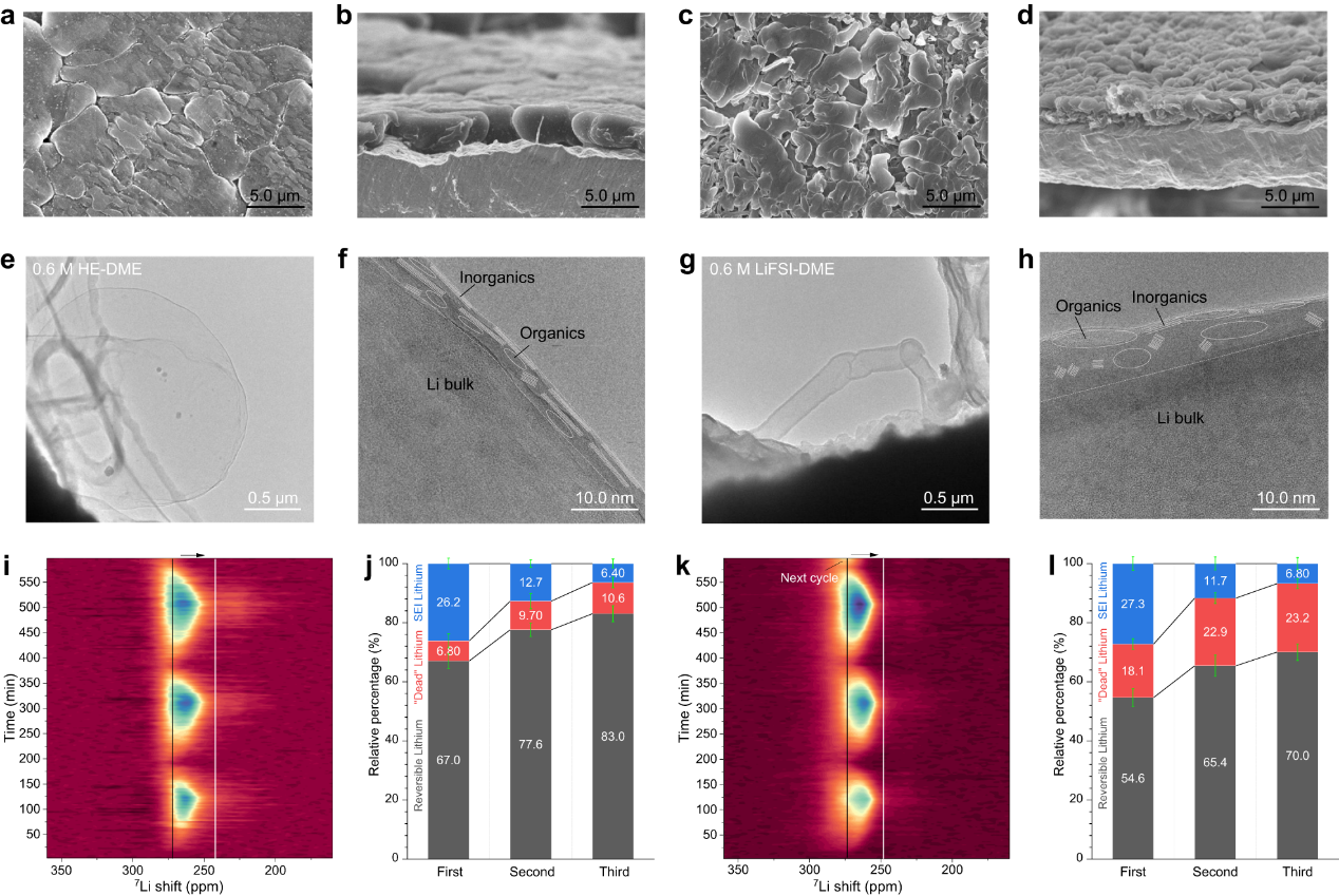 电镀后的锂金属形态:a,b 为0.6 M HE-DME电解液;c, d为0.6 M LiFSI-DME电解液。a, c俯视图;b和d横截面视图。低温透射电镜图像中电解液中沉积的锂金属和界面相的显微结构:e,f为0.6 M HE-DME电解液;g, h为0.6 M LiFSI-DME电解液。Operando 7Li固相核磁共振谱和锂离子的定量:i, j为0.6 M HE-DME电解液;k, l为0.6 M LiFSI-DME电解液。固体电解液间相中的锂(蓝色条)、可逆金属锂(灰色条)和“死锂”残留物种(红色条)中的锂种类来自锂金属积分强度比I(剥离)/I(电镀)和CE。误差条是通过不同的试验得到的。©2023 The Author(s)
