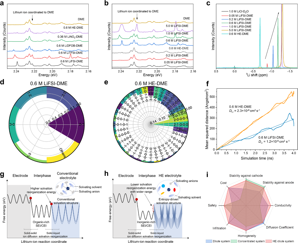 a单一盐和HE电解液的拉曼光谱。b不同LiFSI浓度DME电解液的拉曼光谱。c HE-DME电解液和DME电解液中的LiFSI的7Li NMR谱,参考在D2O溶液中的1 M LiCl。d 0.6 M LiFSI-DME电解液和e 0.6 M HE-DME电解液的锂离子配位环境。f 0.6 M LiFSI-DME电解液(蓝线)和0.6 M HE-DME电解液(橙线)的锂离子自扩散系数(DLi),由MD模拟的均方位移得出。在g常规电解液和h 0.6 M HE电解液中,电极和电解液之间离子传输的示意图。i与常规稀电解液和高浓度电解液相比,HE电解液的性能。©2023 The Author(s)