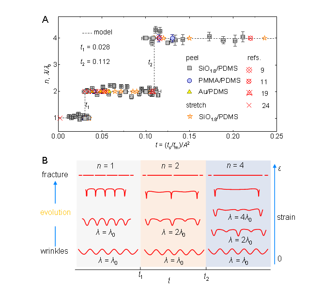 图1. A,软硬双层膜屈曲变形的最终失稳阶次n与软硬双层膜等效厚度比 t之间的台阶式依赖关系。Peel对应剥离实验数据,挤压应力的加载方式是90°弯折剥离软硬双层膜;stretch代表拉伸实验数据,挤压应力加载方式水平拉伸软硬双层膜。Ref.对应收集的实验数据,SiO1.8, PMMA, Au代表三种硬膜,PDMS(聚二甲基硅氧烷)是软膜。B, 示意了最终失稳阶次分别为1,2,4时屈曲结构单元间的转化过程。
