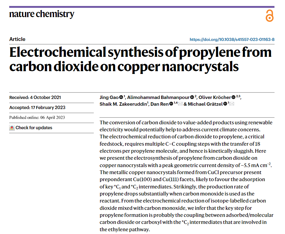 近日,瑞士洛桑联邦理工学院Michael Grätzel和西安交通大学任丹教授等人通过CuCl前体合成出表面由大量Cu(100)和Cu(111)晶面组成铜纳米晶体(CuNC)。CuNC 催化剂使CO2电还原生成丙烯具有明显的选择性和产率。相关的研究成果以“Electrochemical synthesis of propylene from carbon dioxide on copper nanocrystals”为题发表在Nature Chemistry上。