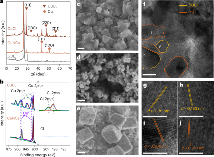 图1 Cu CuNC 的结构和化学表征。a) CuCl 薄膜、预还原 CuNCs 和 GDL 基板的 X 射线衍射图。b )CuCl 和预还原 CuNC 的Cu 2 p和 Cl 2 p的高分辨率 XPS 光谱。c – e)溅射铜膜 ( c )、预还原后的 CuNCs ( d ) 和 CO2在-0.60 V(RHE)还原 10 分钟后的 CuNCs ( e ) 的粗糙化形成的CuCl膜的SEM。f) CuNC催化剂的高分辨率透射电子显微照片。g – j) Cu (100)面 ( g , h ) 和 Cu (111) 面 ( i , j ) 的晶格条纹。©2023 Springer Nature