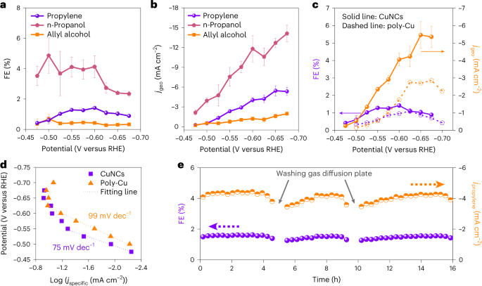 图2在电化学流通池CO2还原过程中CuNC催化剂上C3产物的产生。CuNC 上烯丙醇、丙烯和正丙醇的 FE ( a ) 和部分电流密度( b )作为施加电势的函数。jgeo表示针对催化剂的几何面积归一化的电流密度。c) 丙烯在CuNCs(实线)和多晶铜(虚线)上的 FE(紫色线)和部分电流密度(橙色线)。d) 在 CuNC 和多晶铜催化剂上生产丙烯的Tafel 分析。e )在 CuNCs 上电解16小时丙烯生产的 FE(紫色线)和部分电流密度(橙色线)。©2023 Springer Nature