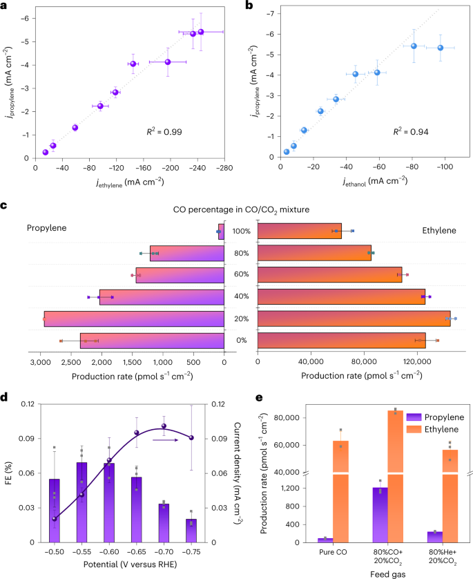 图3 丙烯生产关键中间体的鉴别。a , b) 丙烯的部分电流密度与乙烯( a )和乙醇 ( b )的部分电流密度的函数关系。c)CO/CO2混合物中不同 CO 百分比的 CO/CO2共进料实验期间丙烯和乙烯的生产率。d) FE和在不同电位下从 CO 还原中检测到的丙烯的分电流密度。e)在三种不同进料条件下,CuNC催化剂在-0.60 V(RHE)上的丙烯和乙烯生产率。©2023 Springer Nature