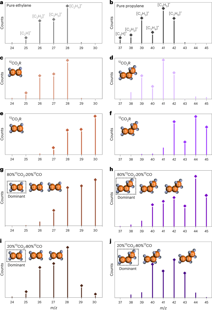 图4不同进料条件下还原的 GC-MS 分析。a , b)乙烯( a )和丙烯( b )标准气体的质谱图。c , e , g , i) 乙烯在12CO2进料 ( c ) 、13CO2 R进料 ( e ) 、80% 13CO2和 20% 12CO共同进料 ( g ) 和 20% 13CO2和 80% 12CO 共同进料 ( i ) 条件 下的质谱。 d, f, h , j ) 12CO2进料 (d)、13CO2进料 ( f )、80% 13CO2和 20% 12 CO共同进料 ( h ) 和 20% 13CO2和 80% 12CO 共同进料 ( j ) 条件下的丙烯质谱。©2023 Springer Nature