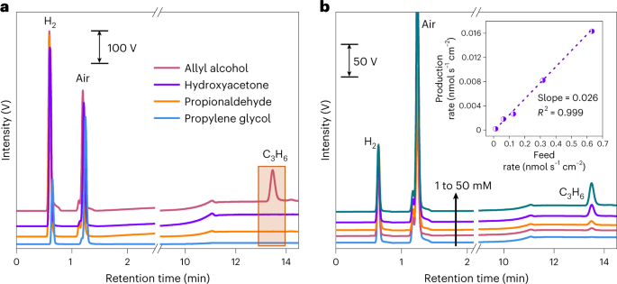 图5用于丙烯生成的*C3中间体的鉴定。a ) 在可能的C3中间体的电化学还原过程中收集的在线气相色谱图。b ) 1、5、10、25 和 50 mM 不同浓度烯丙醇电化学还原过程中收集的在线气相色谱图。©2023 Springer Nature