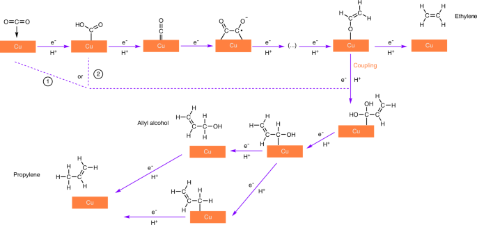 图6在铜催化剂上将CO2电还原为丙烯的机理。CO2首先被还原成*CO中间体。两个*C1中间体之间的偶联导致形成*C2中间体,后者进一步还原为C2产物,例如乙烯。可能的*C1和*C2中间体之间的偶联导致形成C3产物例如丙烯。烯丙醇的直接还原也导致丙烯的形成。©2023 Springer Nature