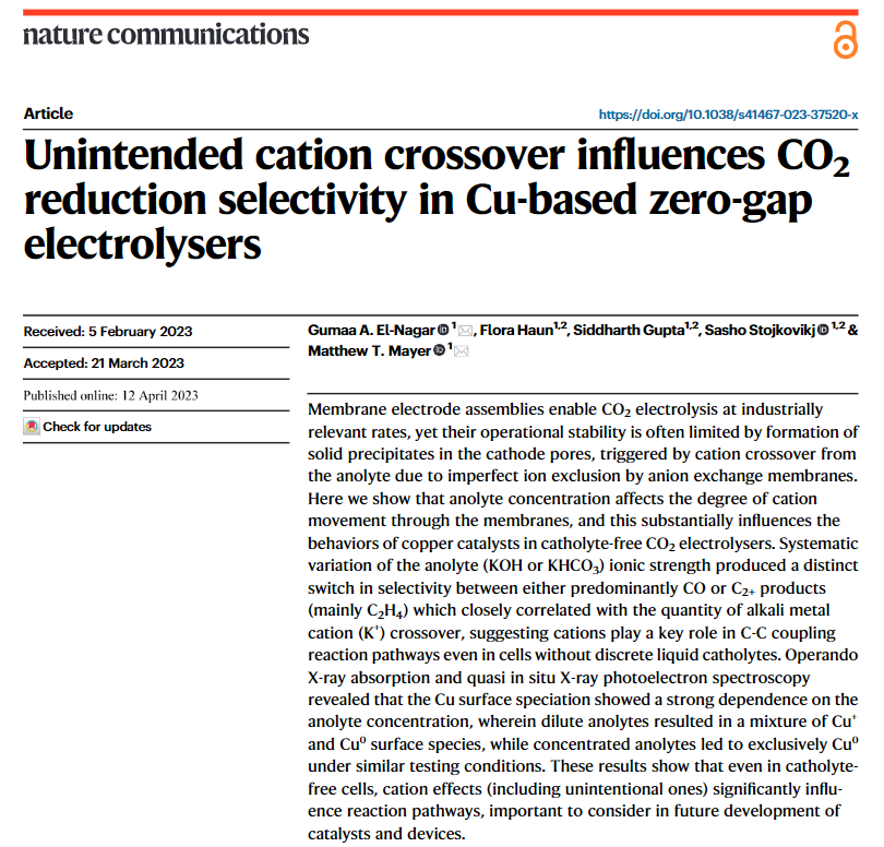 近日,德国亥姆霍兹柏林能源与材料研究中心Matthew T. Mayer团队等人揭示了阳极电解液浓度会影响阳离子通过膜的运动程度,从而影响铜催化剂在无阴极电解液CO2电解槽中的行为。文章以“Unintended cation crossover influences CO2 reduction selectivity in Cu-based zero-gap electrolysers”为题发表在Nature Communications上。