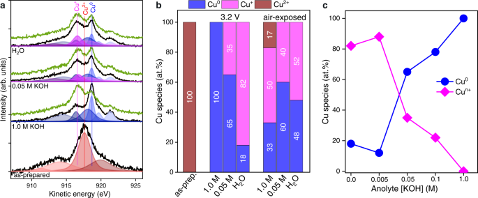 2、原位能谱分析表明,Cu表面形态对阳极电解液浓度有很强的依赖性,在相同的测试条件下,稀释的阳极液会产生Cu+和Cu0混合的表面形态,而浓缩的阳极液则只产生Cu0表面形态。