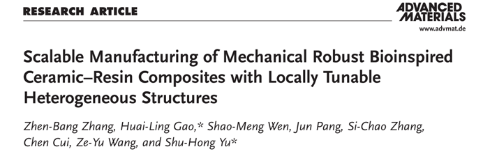 相关研究成果以“Scalable Manufacturing of Mechanical Robust Bioinspired Ceramic–Resin Composites with Locally Tunable Heterogeneous Structures”为题发表在国际顶级期刊ADVANCED MATERIALS上。
