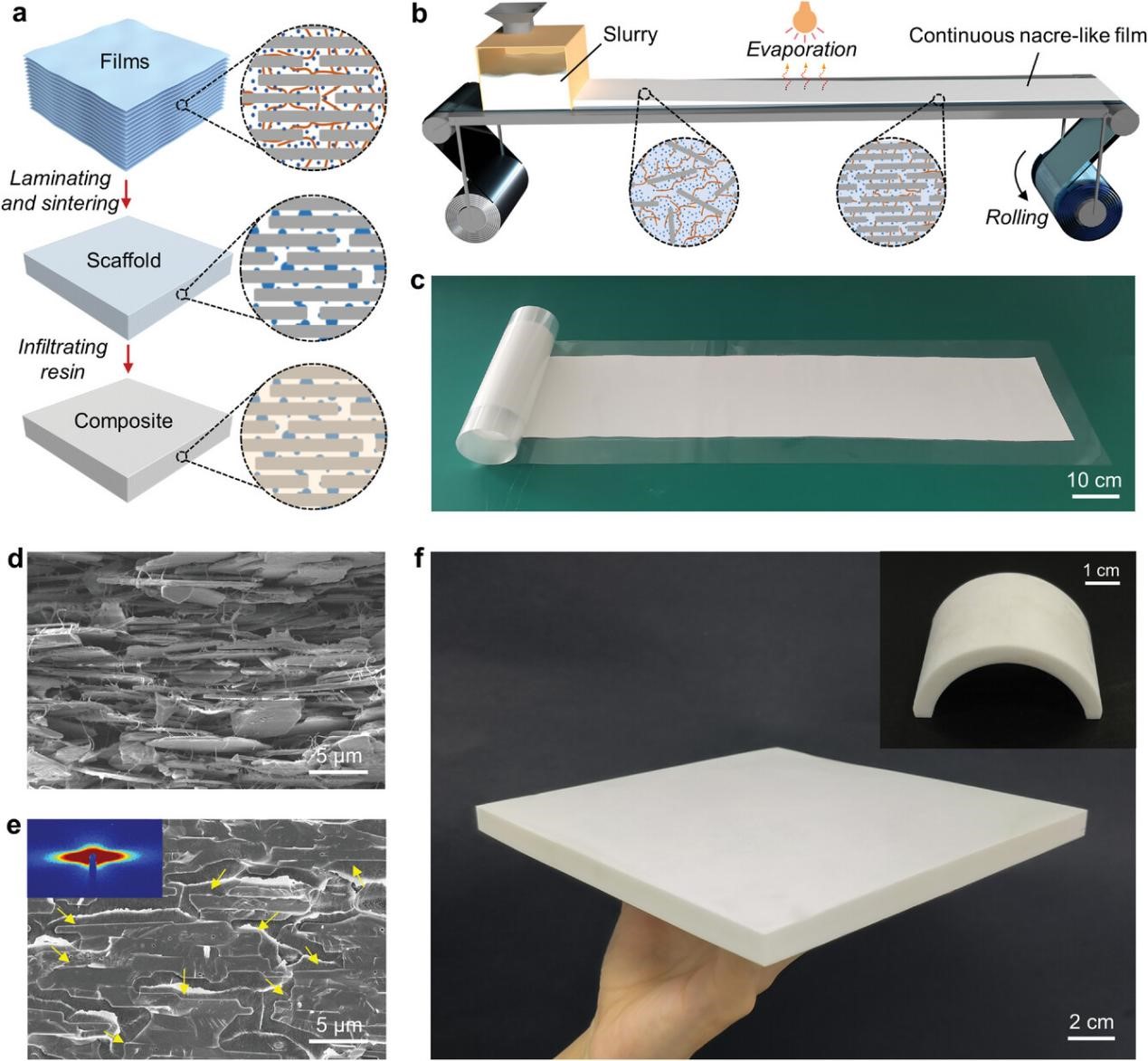 图1 珍珠层状复合材料的大规模制造。a)珍珠层状陶瓷–树脂复合材料的大规模制造过程示意图。b)示意图显示了通过纳米纤维辅助蒸发诱导的自组装方法连续制备珍珠层状复合膜。c、d)通过(b)中所示的连续纤维辅助蒸发诱导自组装方法制备的大规模珍珠层状复合膜的数字照片(c)和截面SEM图像(d)。e)SEM图像显示了珍珠层状陶瓷–树脂复合材料的横截面。黄色箭头突出显示了排列在聚合物基质中的氧化铝微板的边界。插入物显示了聚合物渗透前珍珠层状陶瓷支架的小角度X射线散射图像。f)数码照片显示了一个大尺寸的珍珠层状陶瓷–树脂复合材料和一个拱形的模制珍珠层状瓷树脂复合材料(插入);© 2023 Wiley-VCH GmbH.