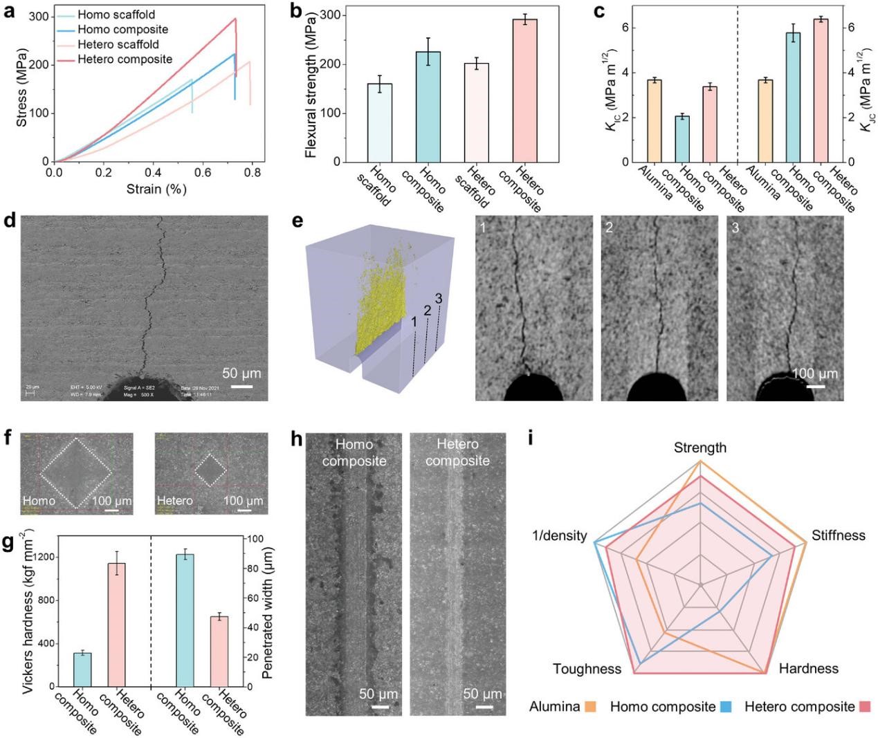 图3 准静态力学性能研究。a)均质珍珠状陶瓷树脂框架和复合材料、异质珍珠状陶瓷树脂框架和复合材料的典型应力–应变曲线。b)均质框架与均质复合材料、异质框架与异质复合材料抗弯强度的比较。c)氧化铝、Homo复合材料和Hetero复合材料的裂纹起裂韧性(KIC)和稳定裂纹扩展韧性(KJC)的比较。d)非均质复合材料断口形貌的SEM图像。e)非均质复合材料裂纹扩展的x射线断层扫描图像。1~3片平行于裂纹扩展方向。f)维氏硬度测试后均质复合材料和非均质复合材料上压痕的光学显微镜图像。g)Homo复合材料和Hetero复合材料微划痕试验后维氏硬度和穿透宽度的比较。h)光学显微镜图像显示了均质复合材料和异质复合材料上的微划痕。i)比较氧化铝、均质复合材料和异质复合材料性能的对比雷达图;© 2023 Wiley-VCH GmbH.