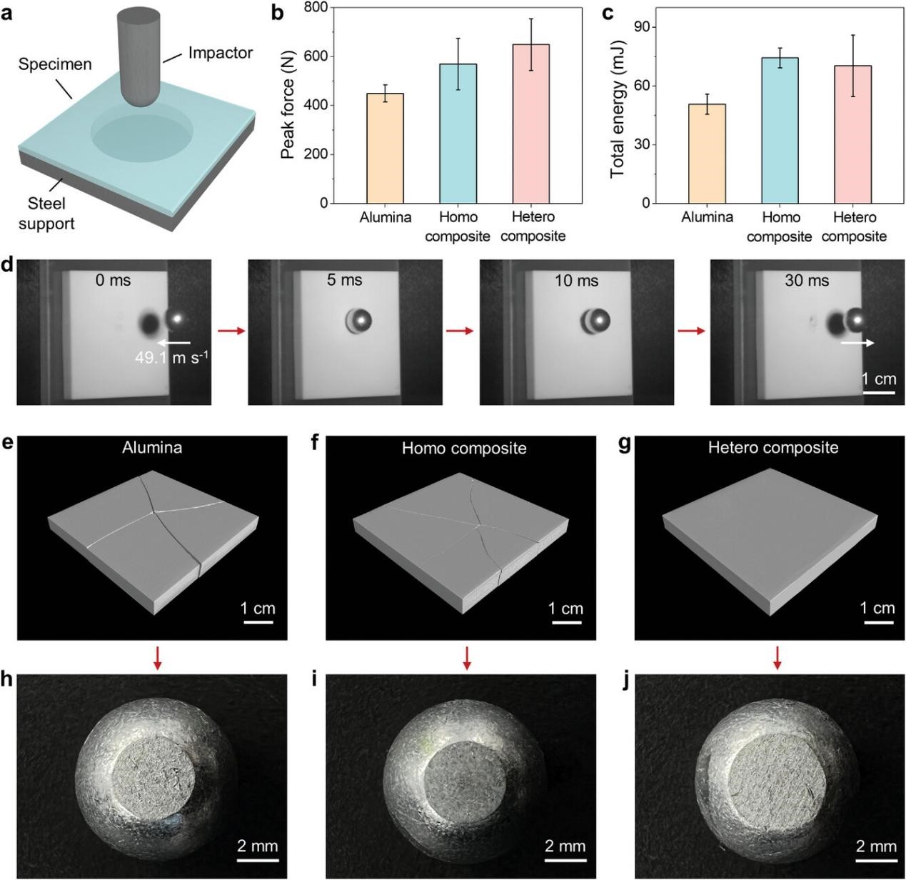 图4 动态冲击力学性能研究。a)显示落锤冲击试验设置的示意图。b)氧化铝、均质珍珠状陶瓷–树脂复合材料和非均质珍珠状陶瓷–树脂复合材料落锤冲击峰值力的比较。c)氧化铝、均质复合材料和异质复合材料在落锤冲击试验中吸收总能量的比较。d)显示非均匀复合材料弹道冲击过程的高速摄像机快照。e-g)氧化铝、均质复合材料和异质复合材料典型试样在弹道冲击试验后的x射线断层扫描图像。h-j)光学显微镜图像显示了典型的氧化铝弹丸在撞击氧化铝、均质复合材料和异质复合材料后具有不同的塑性变形区域;© 2023 Wiley-VCH GmbH.
