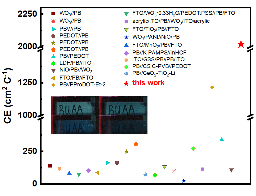 图3:双功能器件与其他文献已报道器件的着色效率对比图