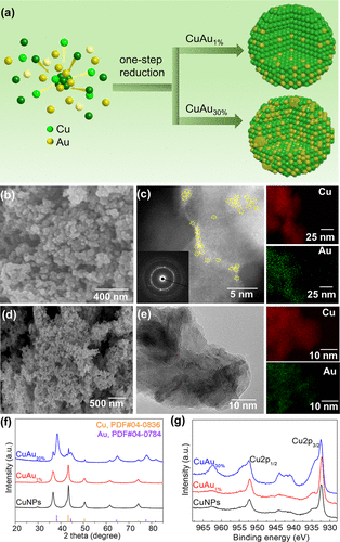 图1 Cu-Au催化剂合成和结构表征。(a) CuAu1%和 CuAu30%制备示意图。(b) CuAu1%的SEM。(c) CuAu1% 的 HAADF-STEM和 EDS 映射。(d) CuAu30%的SEM。(e) CuAu30%的 HAADF-STEM 和 EDS 图谱。(f) XRD光谱。 (g) Cu NP、CuAu1%和 CuAu30%的Cu 2p XPS光谱。© 2023 ACS publication