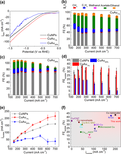 图2使用 1 M KOH 电解液的流通池中的CO电解。(a) Cu NPs、CuAu1%和 CuAu30%的 LSV 曲线;(b) CuAu1%的 CORR产物分布;(c) CuAu30%的CORR产物分布。Cu NPs、CuAu1%和 CuAu30%在不同的电流密度下的 (d) FE乙酸盐和 (e) j乙酸盐。(f) CuAu1%催化剂的 CO 转化为乙酸盐的转化性能与其他报告的比较。© 2023 ACS publication