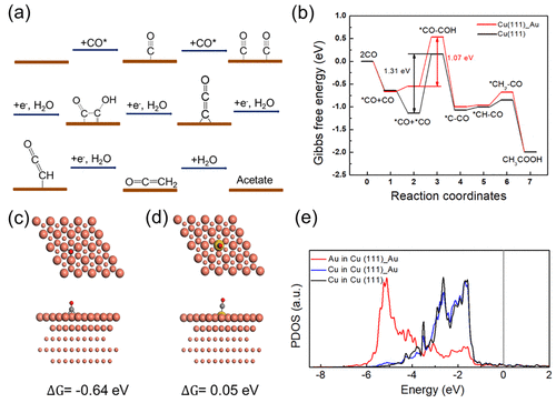 图3 Cu-Au1%催化的CORR DFT模拟。(a) 将CO电还原为乙酸盐的模拟机制。(b) Cu (111)和Au掺杂Cu在0 V(相对于RHE)上形成乙酸的自由能演变。箭头表示潜在的限制步骤。中间体的结构如图S11 和 S12所示. *CO 吸附在 (c) Cu (111) 和 (d) Au 掺杂 Cu (111) 的Au 原子上的优化结构的顶视图(上)和侧视图(下)。*CO吸附的吸附自由能如下所示。(e) Cu (111)上的Cu原子和Au掺杂Cu (111)上的Au和Cu原子的d轨道的PDOS。© 2023 ACS publication