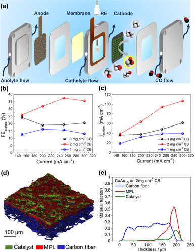 图4 (a) 用于CORR 的碱性流通池示意图。CuAu1%在1、2和3 mg cm–2 CB 上的(b) FE乙酸盐和 (c) j乙酸盐。(d) X射线CT和 (e) CuAu1%在自制GDL和2 mg cm–2 CB上的材料分数。© 2023 ACS publication