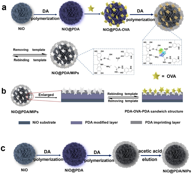 图1 NiO@PDA/MIPs的制备流程图(a)及再结合示意图(b);NiO@PDA/NIPs的制备流程图(c)。