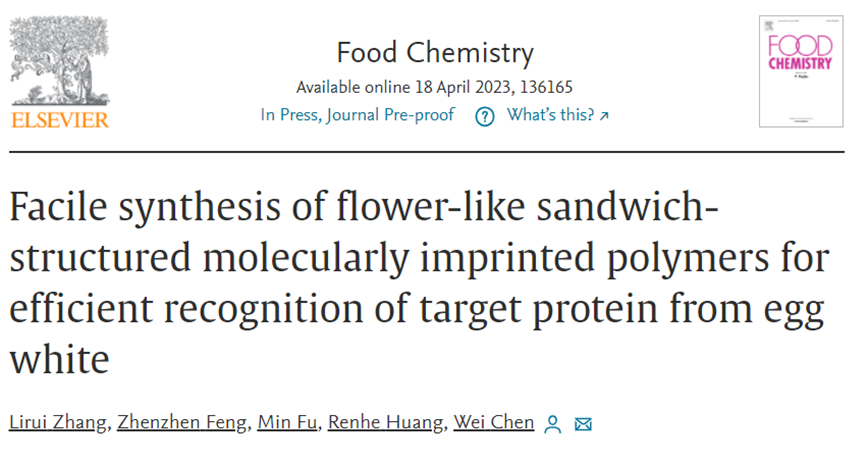 近日,山东HTH官网地址 大学化学与生物工程学院陈伟副教授采用表面印迹技术制备了花状三明治结构NiO@PDA/MIPs并用于卵清蛋白(OVA)的快速灵敏富集与检测。本研究开发了PDA-OVA-PDA夹层结构,该结构增强了OVA与印迹层之间的界面相互作用,结合了识别位点均匀、传质快、合成过程简单温和等优点。由于花状结构的大表面积和聚多巴胺层上的多官能团,NiO@PDA/MIPs具有大的结合容量,高效的吸附动力学和对OVA的优异选择性,实现了从复杂生物基质中对卵清蛋白的高效提取。相关研究成果以“Facile synthesis of flower-like sandwich-structured molecularly imprinted polymers for efficient recognition of target protein from egg white”为题,发表在应用化学和食品HTH官网地址 TOP期刊Food Chemistry(IF:9.231,SCI一区,中科院一区)上。