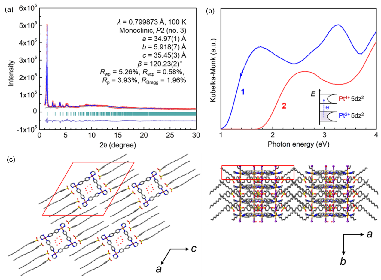 Figure 1. 纳米管的固态结构解析。(a)化合物1的PXRD及其Rietveld拟合。(b)化合物1和2的漫反射光谱。(c)化合物1的晶体堆积结构。