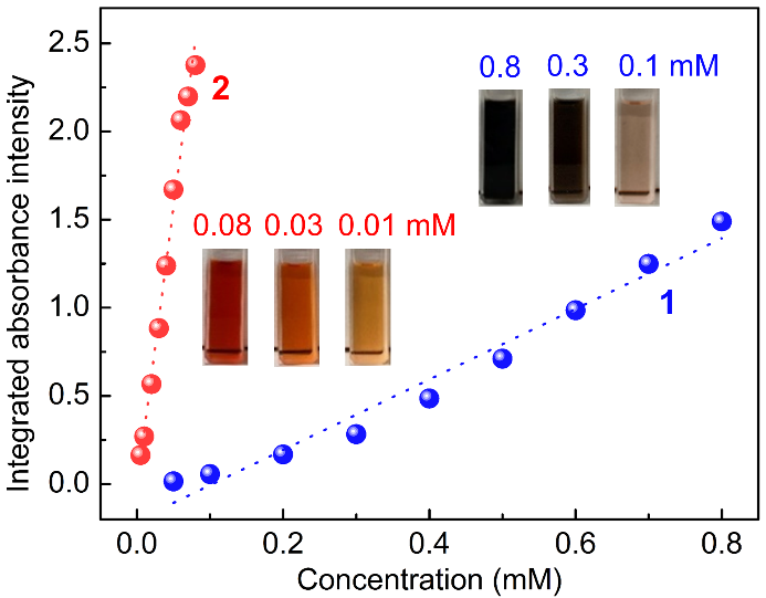Figure 2. 不同浓度的化合物1和2在氯仿溶液中的IVCT(inter-valence charge-transfer,价间电荷转移)吸光度比较。