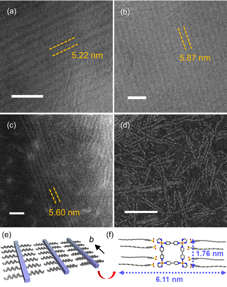 近日,日本京都大学北川宏(Hiroshi Kitagawa)教授等人首次合成了一种可溶性金属-有机纳米管, [Pt(en)(bpy)X]4(dbs)8·nH2O (en: ethylenediamine, bpy: 4,4′-bipyridine, dbs: dodecyl benzene sulfonate, X = I (化合物1), Br (化合物2)).。四条金属卤素桥接一维链(MX-chain)通过有机配体连接形成管状结构。其结构独特之处在于:该纳米管由阳离子性纳米管管框架和长烷基链阴离子组成。得益于结构性的长烷基链,该纳米管不仅能以聚集固态形式存在,也能稳定溶解于有机媒介而无需任何额外的表面化学修饰,这与传统的纳米管体系明显不同。此外,通过电子显微技术首次直接观测到金属-有机纳米管的管束结构,这得益于该纳米管的良好溶解性及溶剂挥发时的自组装驱动。最后,作者使用纳米管溶液制备了单分子、双分子层的薄膜,为未来的薄膜应用提供可能,如在光学薄膜、离子传导膜等领域。相关成果以“Self-Assembled Crystalline Bundles in Soluble Metal–Organic Nano-tubes”发表在J. Am. Chem. Soc上。