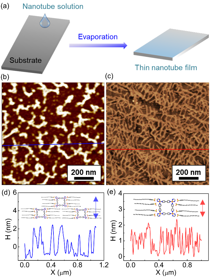 Figure 4. (a)纳米管的薄膜制备示意图。(b, d)化合物1和(c, e) 2薄膜的AFM图像及高度曲线。基板:硅片。
