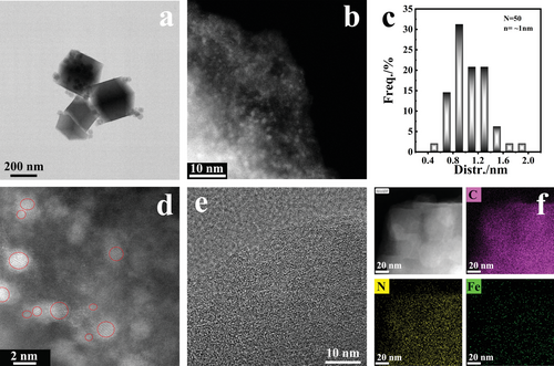 图1 a) Fe2C-Cs@DC低倍TEM照片。b) Fe2C-Cs@DC在高倍放大下的TEM图像。c) 根据 (b) 的相应粒度分布。d) Fe2C-Cs@DC中的Fe 簇由红色圆圈显示。(e) Fe2C-Cs@DC中碳的 HRTEM 图像。(f) Fe2C-Cs@DC中的C、N 和 Fe元素的EDX图。© 2023 Wiley