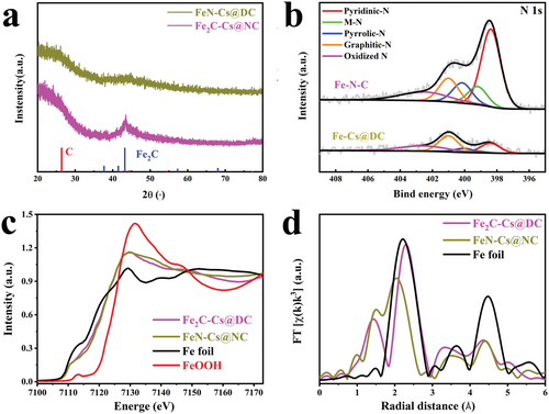 图2 a) Fe2C-Cs@DC和FeN-Cs@NC的XRD图。b) Fe2C-Cs@DC和FeN-Cs@NC的N1s的XPS光谱。c) Fe2C-Cs@DC、FeN-Cs@NC 、Fe箔和FeOOH的Fe K-edge XANES光谱。(d) Fe2C-Cs@DC 、FeN-Cs@NC和Fe箔的k3-weighted EXAFS的傅立叶变换光谱。© 2023 Wiley