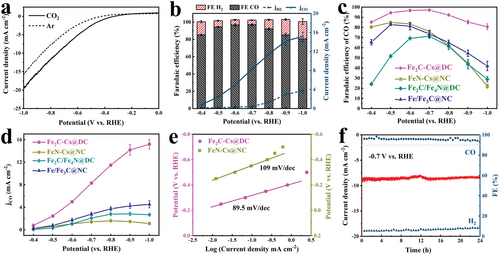 图3 a) Fe2C-Cs@DC在CO2饱和(实线)和Ar饱和(虚线)的0.1 M KHCO3水溶液中的LSV。b) CO(灰色)和H2(红色)的法拉第效率以及CO在一定范围的施加电势下的部分电流。c)在不同应用电位下,各种催化剂的CO法拉第效率。d)在不同施加电位下,各种催化剂的CO部分电流密度。e) Fe2C-Cs@DC和FeN-Cs@NC在 0.1 M KHCO3水溶液中CO部分电流密度的塔菲尔图。f) Fe2C-Cs@DC在-0.7 V vs RHE电位下24 h的CO2RR稳定性测试。© 2023 Wiley