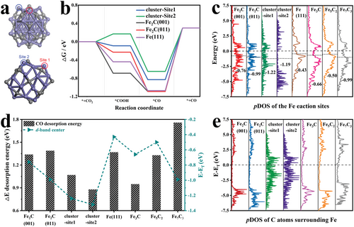 图4 a) 两种不同观点下研究的簇模型。两个潜在的反应位点以圆圈突出显示。b) CO2RR过程在各种含铁模型上的自由能分布。c) 各种Fe 反应位点的d带中心。d)各种反应位点的解吸能和d带中心。e) Fe周围各种C原子的p带中心。© 2023 Wiley