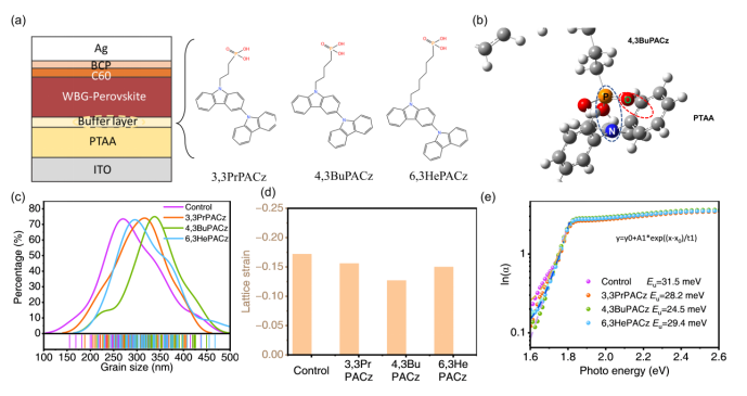 图 1. a) 用于表面改性的器件结构和分子结构以及单分子的化学结构。 b) PTAA 和 4,3BuPACz 之间的化学相互作用示意图。 c) 在用单分子层修饰的 PTAA 上生长的 WBG 钙钛矿的晶粒尺寸分布。 d) 在用单分子层修饰的 PTAA 上生长的 WBG 钙钛矿的晶格应变。e) 在用单分子层修饰的 PTAA 上生长的 WBG 钙钛矿的 Urbach 能量。