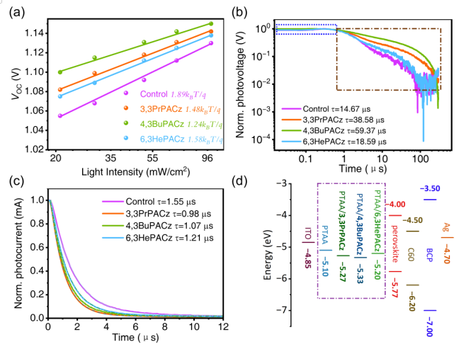 图 3. a) 在 PTAA,PTAA/3,3PrPACz,PTAA/4,3BuPACz 和 PTAA/6,3HePACz基底上制造的PSC 的 VOC 与光强度的关系,b) TPV 衰减曲线和 c) TPC 衰减曲线。 d) 器件的能带排布示意图。