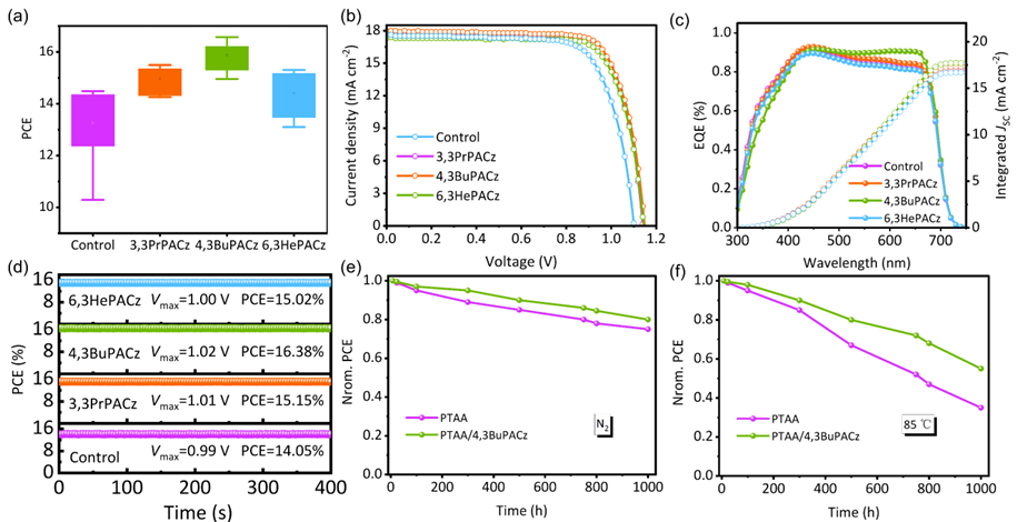 图 2.在 PTAA,PTAA/3,3PrPACz,PTAA/4,3BuPACz 和 PTAA/6,3HePACz基底上制造的PSC 的a) PCE 统计分布图,b) J-V 曲线, c) IPCE 曲线和 d)稳态效率随时间的变化。 e) 在 PTAA 和用 4,3BuPACz 改性的 PTAA 上制造的 PSC 在室温下储存在充满氮气的手套箱(无封装)中的 N2 稳定性。f) 在 PTAA 和用 4,3BuPACz 改性的 PTAA 上制造的未封装 PSC 的热稳定性,在黑暗中保持在 85 ℃ 的氮气手套箱中。