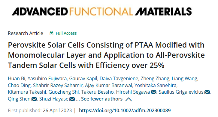 Citation: Bi, H., Fujiwara, Y., Kapil, G., Tavgeniene, D., Zhang, Z., Wang, L., Ding, C., Sahamir, S. R., Baranwal, A. K., Sanehira, Y., Takeshi, K., Shi, G., Bessho, T., Segawa, H., Grigalevicius, S., Shen, Q., Hayase, S., Perovskite Solar Cells Consisting of PTAA Modified with Monomolecular Layer and Application to All-Perovskite Tandem Solar Cells with Efficiency over 25%. Adv. Funct. Mater. 2023, 2300089. https://doi.org/10.1002/adfm.202300089
