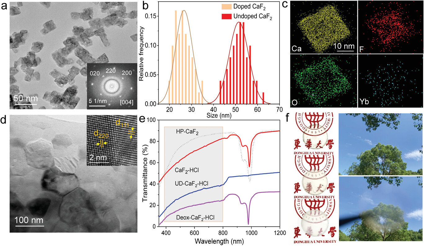 图1氟化钙纳米粉体及氟化钙透明陶瓷的表征。(a) 掺杂镱的氟化钙的纳米粉体的微观形貌;(b) 掺杂镱氟化钙和未掺杂镱的氟化钙的粉体尺寸对比;(c) 掺镱氟化钙的纳米粉体的元素分布;(d) CaF2-HCl透明陶瓷的微观结构;(e) CaF2-HCl透明陶瓷的透过率;(f) CaF2-HCl透明陶瓷在自然光下的数码照片。