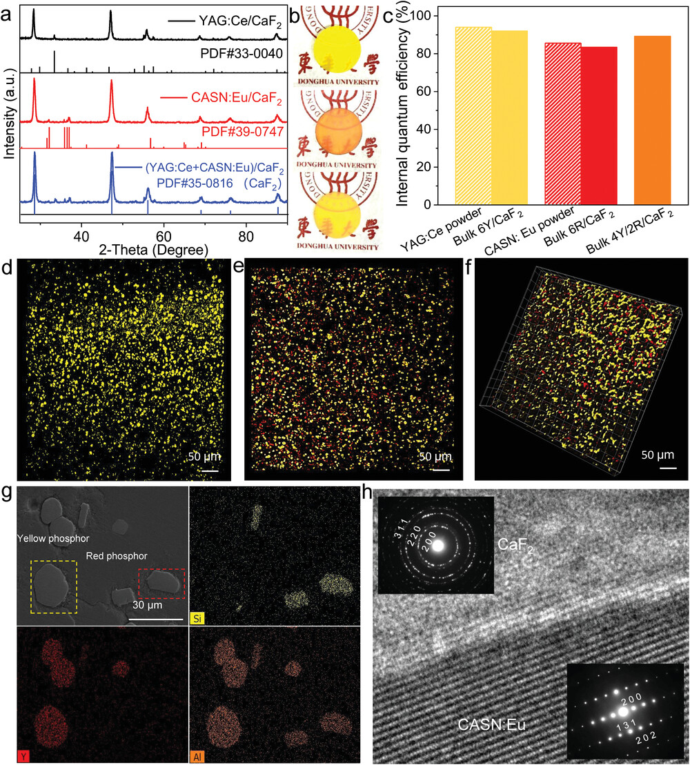 图3 氟化钙荧光陶瓷的微观结构分析。(a) 氟化钙基荧光陶瓷的XRD研究;(b) 不同的氟化钙基荧光陶瓷的数码照片;(c) 封装后荧光粉的量子效率;(d-g) 荧光粉在陶瓷基体中的分布;(h) 红色荧光粉和氟化钙基体之间的界面。